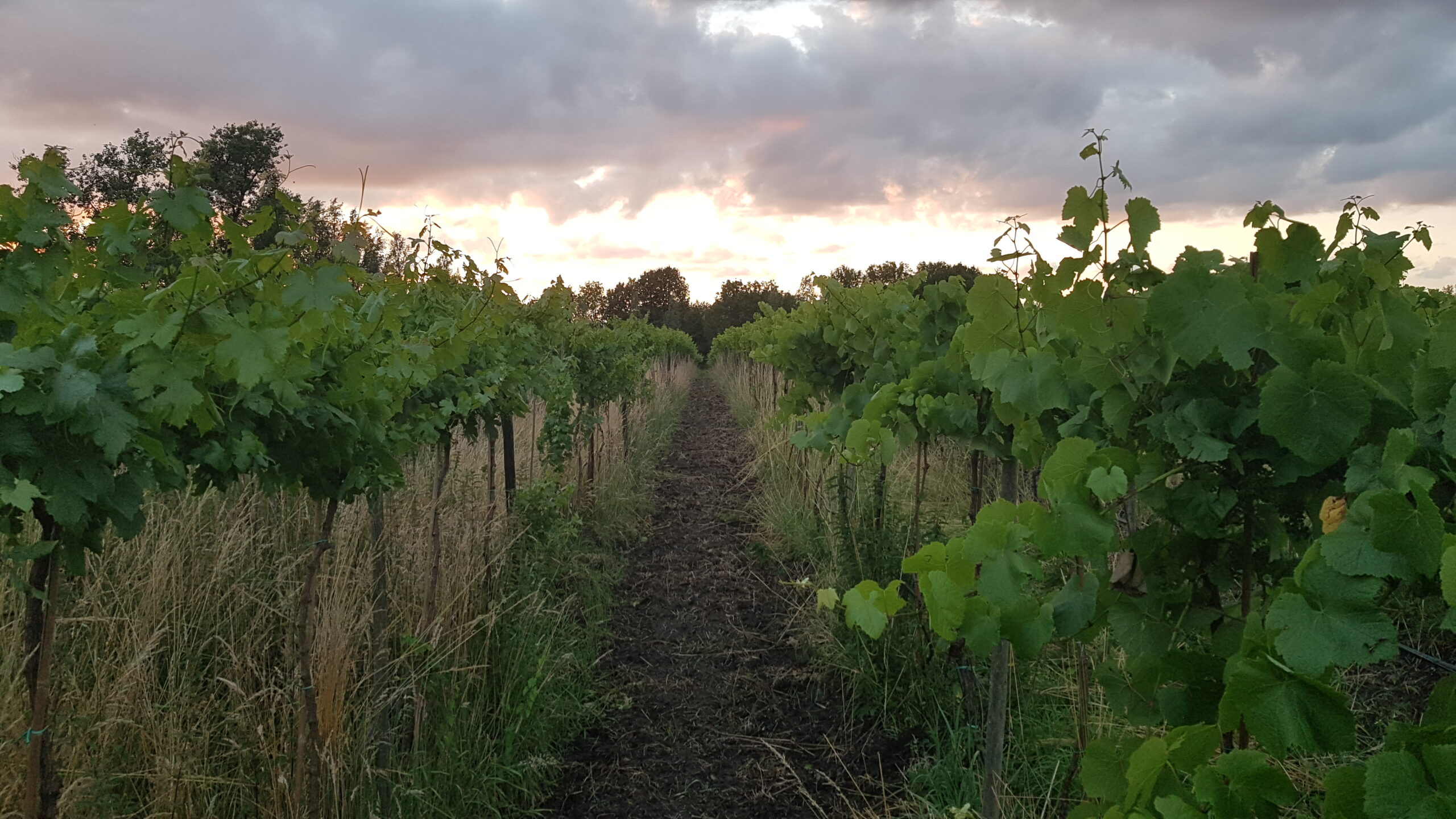 De rijen worden om en om ingezaaid met een grasmengsel en een mengsel van groenbemesters. De grasrijen dienen om overheen te rijden en te lopen. De grasrijen worden ook weer om en om gemaaid zodat er nog voldoende nuttige insecten in de ongemaaide rijen kunnen overleven. Vooral als er droog weer wordt voorspeld maaien we het gras kort zodat het gras minder water verbruikt en er meer voor de druiven overblijft. Is het regenachtig weer dan kan het gras juist wat langer blijven zodat het een buffer vormt voor de druiven.